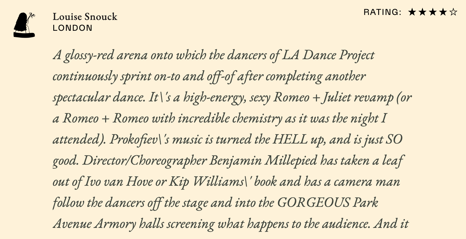 [DANCE] Romeo and Juliet Suite at the Park Avenue Armory. LA Dance Project’s R+J serves a condensed version of Shakespeare’s story told in contemporary-classical dance, set to the exquisite music of Sergei Prokofiev (banger after banger). Featuring video transmitted live from the gorgeous Armory halls to onstage screens it feels very Ivo van Hove or Kip Williams-esque (and if those names mean nothing to you, please ignore the wanky theatre-talk) and is rather thrilling in the dance context. On through March 21. Book Now.