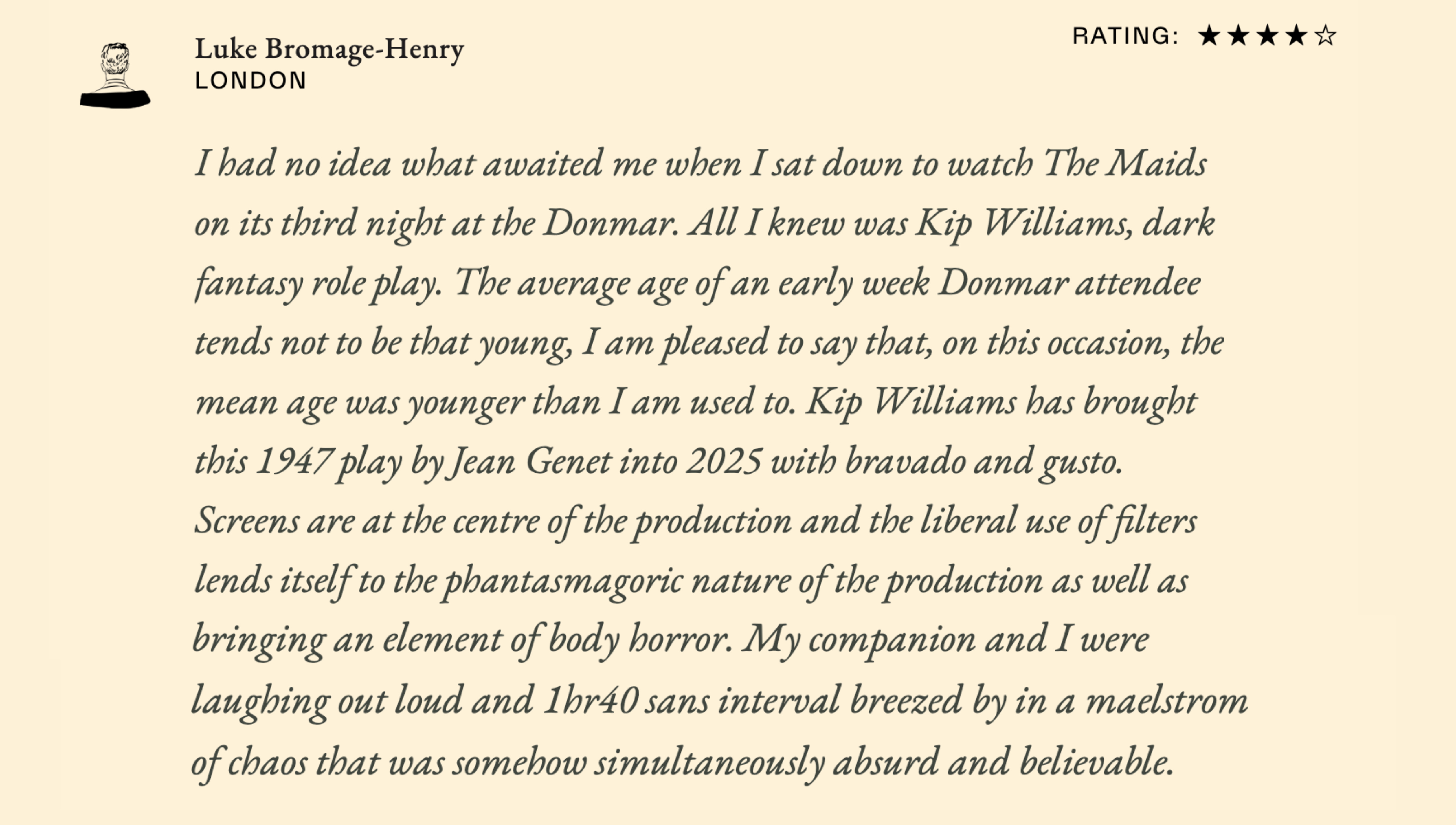 [THEATRE] The Maids at St Anns Warehouse. Director of the moment Kip Williams follows his astounding production of The Picture of Dorian Gray (starring Sarah Snook) with this reimagining of Jean Genet’s classic play which was a smash-hit in London. An absurdist drama about two role-playing sisters who act out the master-servant relationship like an elaborate game of Dom/Sub make-believe pushed to the extreme. May 17-June 17. Book Now.