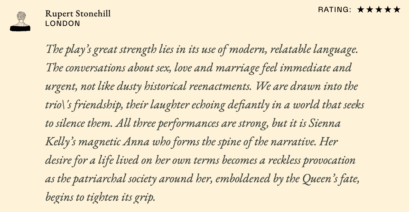 [THEATRE] 1536 at The Ambassadors Theatre. This brilliant historical drama set against the impending execution of Anne Boleyn is being transferred to the West End following a pretty electrifying debut at the Almeida Theatre. Margot Robbie has even thrown her weight behind its young playwright Ava Pickett and is one of the shows producers. May 2-August 1. Book Now.